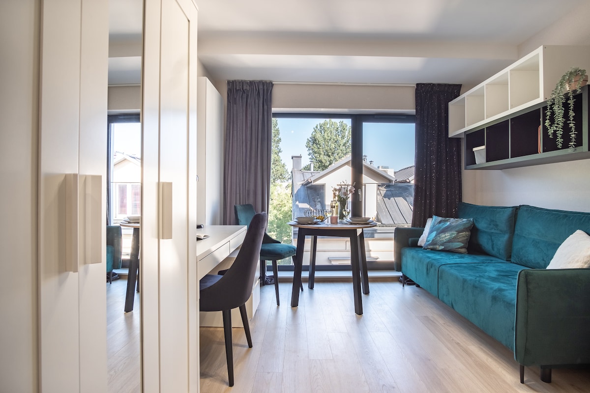The APARTMENT PARK GRZEGÓRZKI is located in the city center, right in the heart of Krakow, near the Old Town, and only a 10-minute walk from the Main Railway and Bus Station. It's also conveniently close to the Courthouse, Opera, and the University of Economics. This newly furnished apartment offers all amenities, including access to a large terrace with a garden view. It's provides free parking in the garage, fast WiFi, Netflix, air conditioning. It's in a peaceful, green neighborhood.