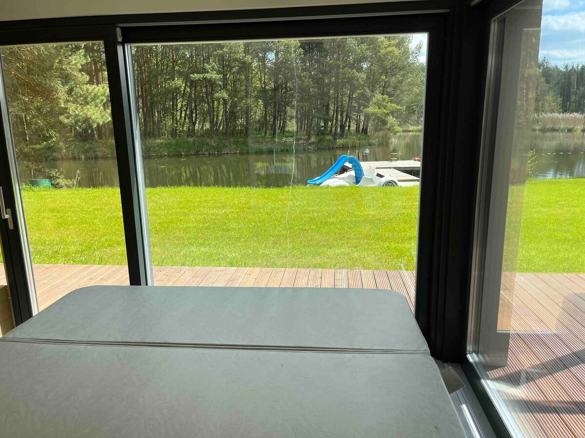 Nowoczesne i przestronne wnętrza na skraju lasu, w otoczeniu natury. Jeśli chcesz spędzić czas w spokojnej, chillowej atmosferze (oglądając film na projektorze czy biorąc relaksacyjną kąpiel z widokiem na przyrodę) to miejsce idealne dla Ciebie. Trzy dwuosobowe sypialnie; przestronny salon z rozkładanym narożnikiem; w pełni wyposażona kuchnia; dwie łazienki, taras i zewnętrzne jacuzzi do użytku w lecie. Zakaz organizowania głośnych imprez. Nie przyjmujemy grup samych mężczyzn.