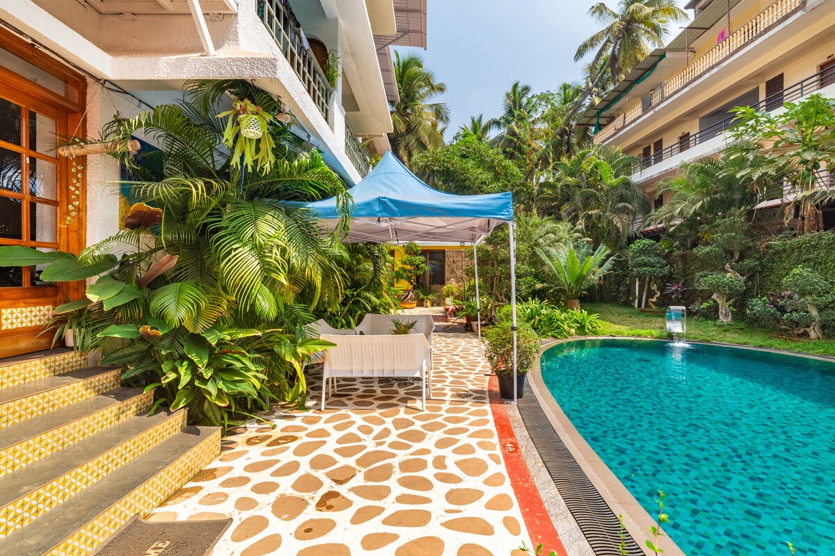 Experience the charm of a botanica setting, where comfort meets nature. Newly Renovated Full Furnished apartment. centrally located between Calangute and Candolim beach and markets. Whether you are family seeking a spacious retreat or a couple looking for a romantic escape, our home welcomes with you modern amenities, refresh greenery and a touch of luxury. Spacious and airy. Fully equipped kitchen Safe and secure: 24/7 secure , gated community. PrimeLocation: Beaches, markets, night clubs.