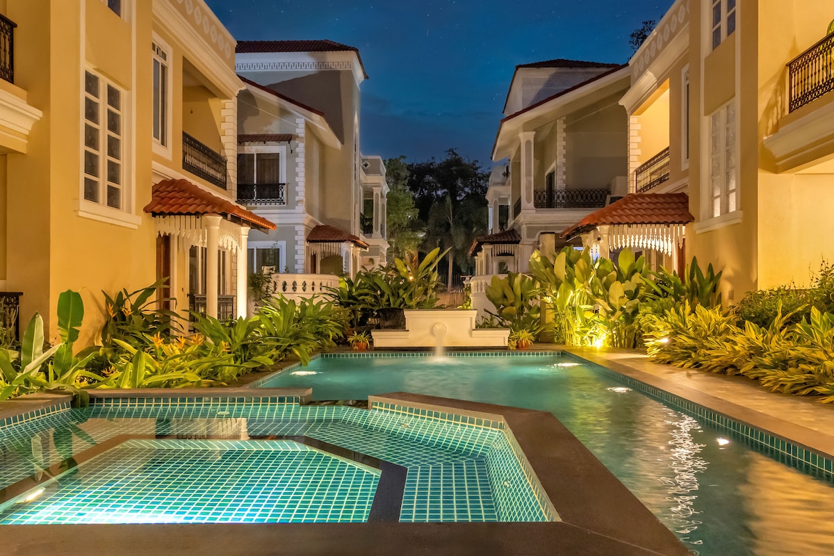 Questa splendida villa duplex con vista sulla piscina si trova in posizione centrale in un lussuoso complesso recintato all'incrocio tra Anjuna e Vagator. La villa dispone di un ampio soggiorno, un ascensore interno privato e tre grandi camere da letto con bagni annessi, più un bagno in comune. Ogni camera ha il proprio balcone. Gli ospiti possono rilassarsi nella piscina in comune o nella vasca idromassaggio privata sul tetto! Spiagge come Anjuna, Vagator e Ozran sono a 8–10 minuti di distanza, con ottimi ristoranti e caffè a 5 minuti di auto