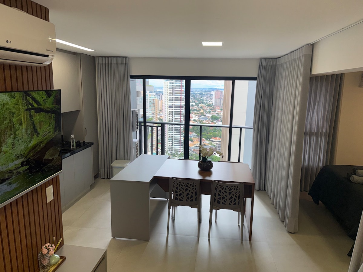 ❗️Un nuovo🤩 Condominio unico, elegante e sofisticato, fatto per farti sentire a casa tua. Guarda il tuo film preferito in camera da letto o in soggiorno sulla più moderna Smart TV girevole con aria condizionata, tavolo da pranzo e zona lavoro dedicata. Riposa nel letto migliore, goditi la doccia più deliziosa, goditi il balcone e un bellissimo tramonto con vista sul parco e goditi il contemporaneo Setor Bueno nella migliore regione di Goiânia ! Condomínio Tai Residências