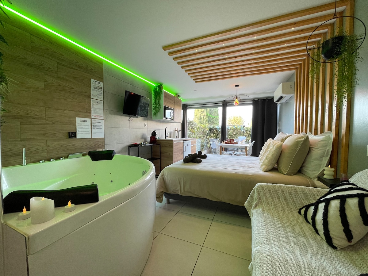 💫 Vivi una fuga romantica a Cap d'Agde con spa privata e giardino alberato❣️ Rilassati nella tua vasca idromassaggio interna con getti massaggianti e cromoterapia, goditi un accogliente letto queen size, una terrazza per la colazione all'aperto e WiFi ad alta velocità. Residenza tranquilla e sicura, a due passi da negozi, spiaggia Richelieu, Aqualand, golf, Île des Loisirs e Amnesia.