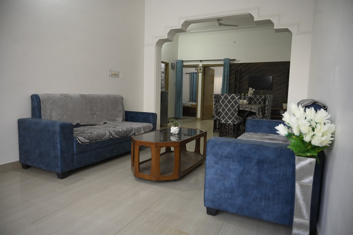 Benvenuti nel nostro accogliente attico al secondo piano, con ingresso privato e un incantevole patio. La casa offre 2 camere da letto climatizzate, ciascuna con letto king-size, 2 bagni (uno annesso, uno nel soggiorno), una cucina con filtro dell'acqua RO e una piccola area comune con frigorifero. Sono inoltre disponibili il wifi Airtel ad alta velocità e una scrivania. Nota: se la prenotazione è per 1 o 2 ospiti, 1 camera da letto e il bagno rimarranno chiusi per un'esperienza più personalizzata.