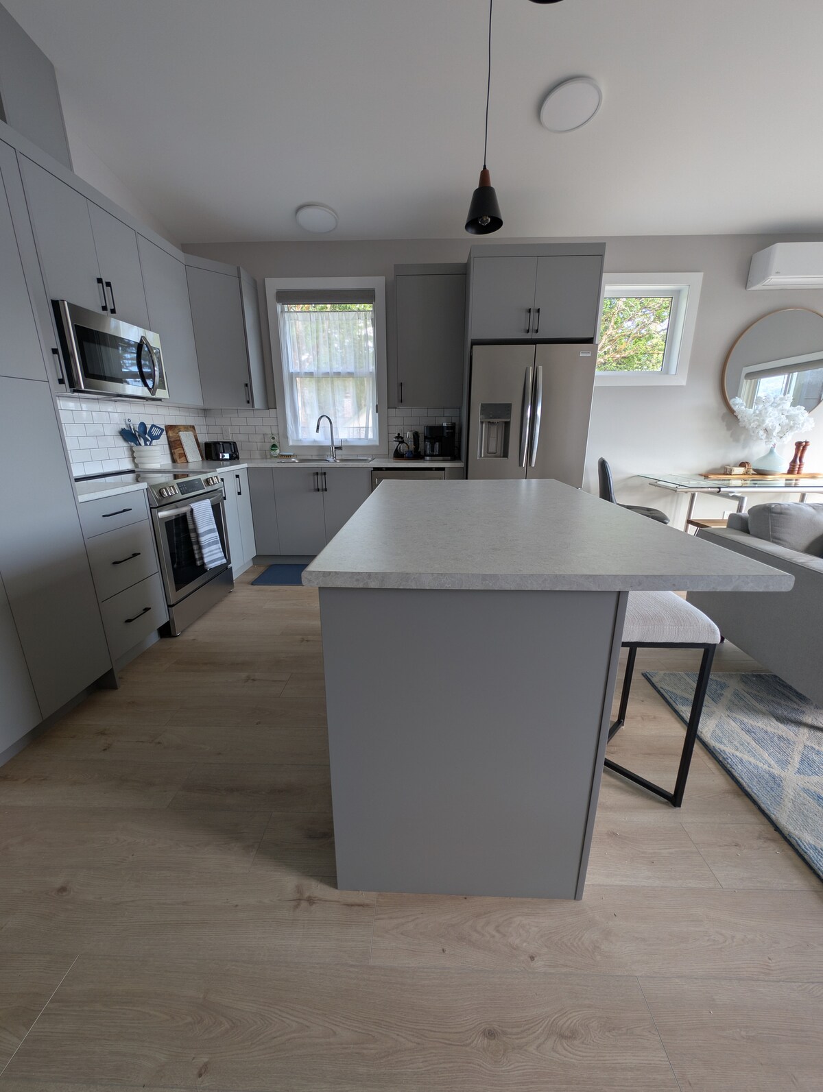 Questa suite può ospitare da 1 a 4 persone: 93 metri quadri con ingresso privato. Soggiorno con Smart TV UHD da 49 pollici. Zona pranzo con posti a sedere per quattro persone. Cucina completamente attrezzata con piano cottura, frigorifero, forno a microonde, tostapane, bollitore e macchina per il caffè. Il bagno è dotato di doccia in vasca, wc e lavabo. Questa è una suite al piano inferiore con molto spazio per la testa, a meno che tu non sia estremamente alto. L'altezza dal pavimento al soffitto è di 2,03 metri, dove una trave di supporto attraversa il soffitto, dove l'altezza libera è di 1,88 metri