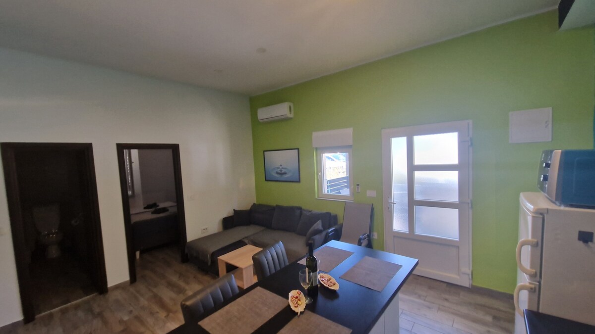 Beautiful, new renovated apartment, with sea view and perfect location. 1km from city center, 800m from most beautiful beaches. The apartment (44m2) consists of large open plan living / dining room with fully equipped kitchen and sofa bed, large bathroom, bedroom with king size bed and large private terrace. Free WI-FI, several international TV channels, air conditioning.