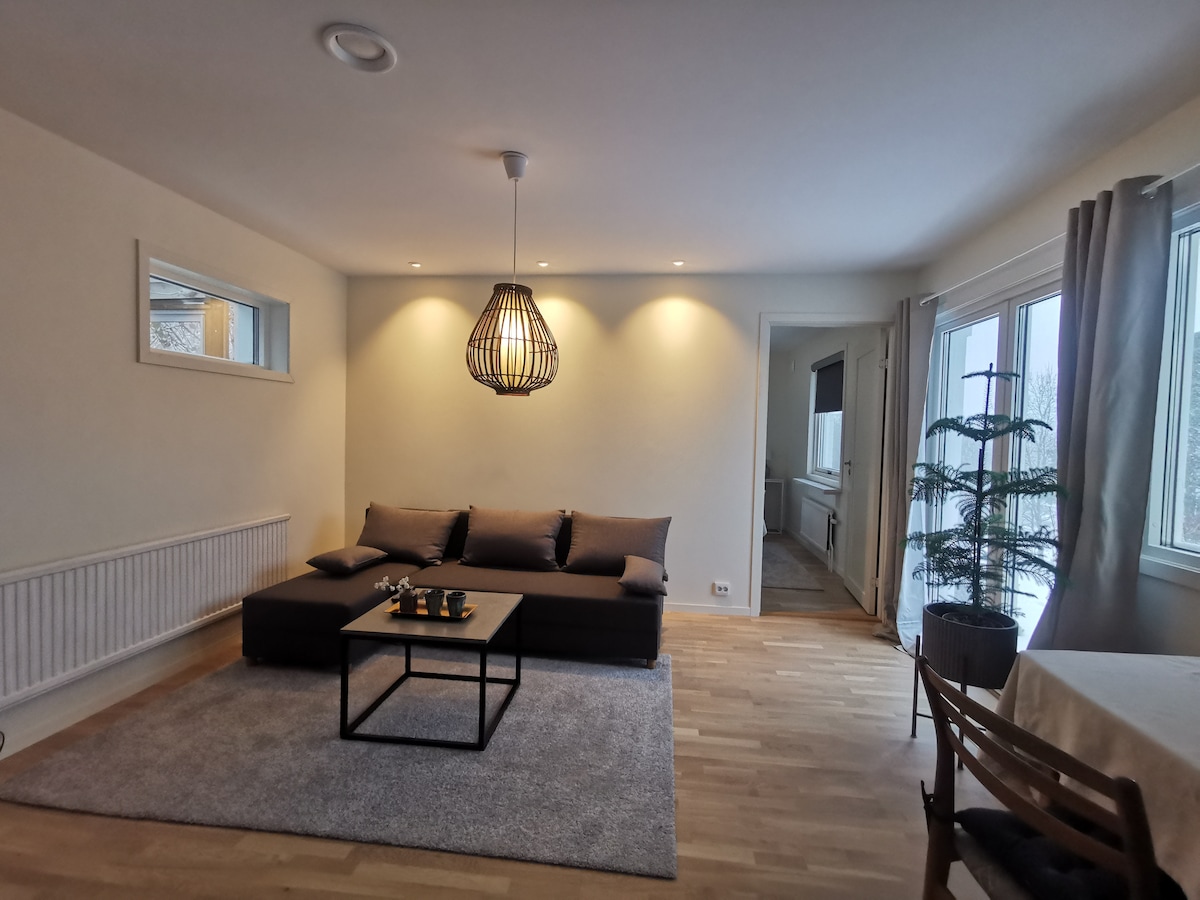 Grazioso appartamento in affitto in una tranquilla zona residenziale. Patio privato. L'appartamento ha una pianta a pianta aperta. Completamente ristrutturato. Un letto matrimoniale divisibile e un divano letto. Adatto per 3 adulti o famiglie con 2 bambini. Letto aggiuntivo su richiesta. Cucina attrezzata con tutti i servizi. Lavastoviglie, forno a microonde, piano cottura/forno, piano cottura/forno, doccia, doccia, WC, lavatrice, frigo e freezer, internet veloce, wifi e TV. Zona vicina con laghi balneabili e sentieri. 15 minuti in autobus per il centro di Göteborg e circa 5 minuti a piedi dal Mölnlycke Centrum.