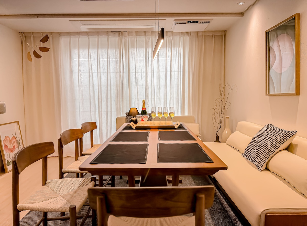 Grande casa: 2 soggiorni, 4 camere da letto, 2 bagni, terrazza (2 piani, collegati da una scala interna e uno spazio privato) Posizione: 4 minuti a piedi (dalla stazione dell'Università di Hongik) e molti ristoranti e negozi. Recentemente è diventata la strada più alla moda della Corea (ma non preoccuparti. La casa è tranquilla) Letti di alta qualità: 9 letti in totale, lenzuola in 100% cotone, coperta in piuma d'anatra Ideale per soggiorni lunghi: depuratore d'acqua, lavatrice e asciugatrice, aria condizionata LG, asciugacapelli Dyson, aspirapolvere ※ Parcheggio per 1 auto