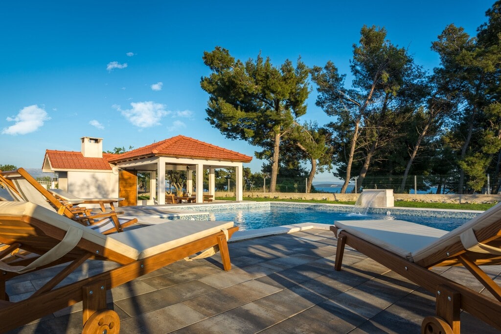 La villa è su due piani, collegati da scale interne. Al piano terra si trovano un soggiorno con vista sulla piscina e accesso all'area esterna, una cucina con accesso a un barbecue coperto all'aperto, un bagno e una camera con bagno privato. Al secondo piano ci sono 3 camere, una galleria con vista sul cielo e il bagno. All'esterno sono presenti una piscina, un'area solarium, una doccia, una vasca idromassaggio e un trampolino. La casa dispone di 4 posti auto; Spalato dista 16 km, l'aeroporto 3 km, Trogir 13 km, mentre la spiaggia è molto vicina. Autobus, farmacia, mercato e panetteria si trovano a 100 metri.