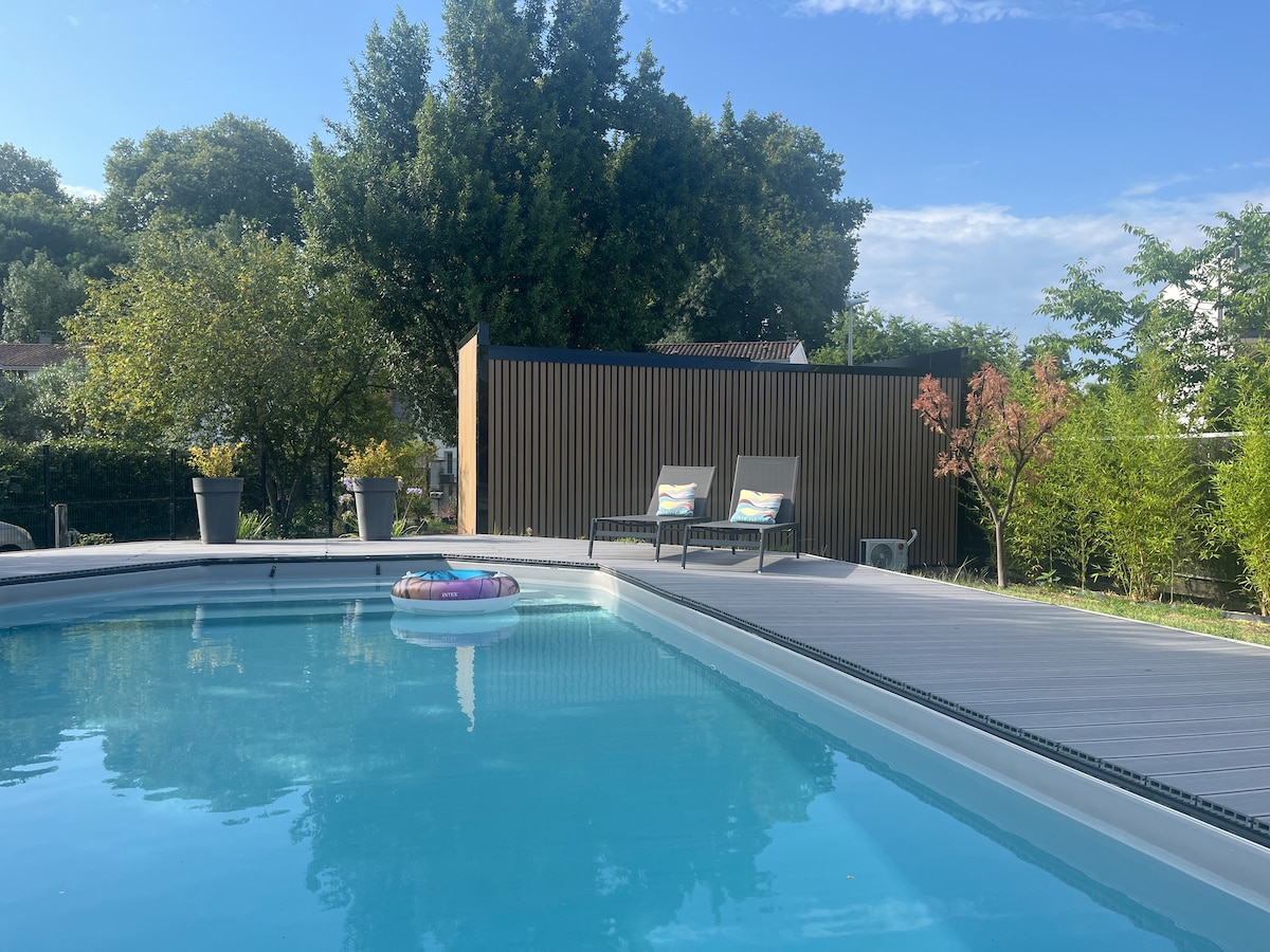 apartment 60 m2, brand new, all equipment Huge main room (28 m2) with integrated kitchen (dishwasher, expresso machine, ...), front to huge wooden deck with private heated swimming pool 10x5m secured by rolling shutter, nice view on Garonne valley, nice garden, land 2500 m2, two rooms (11,5 m2 each), bathroom, separated toilet The upper part of the house is where we live.