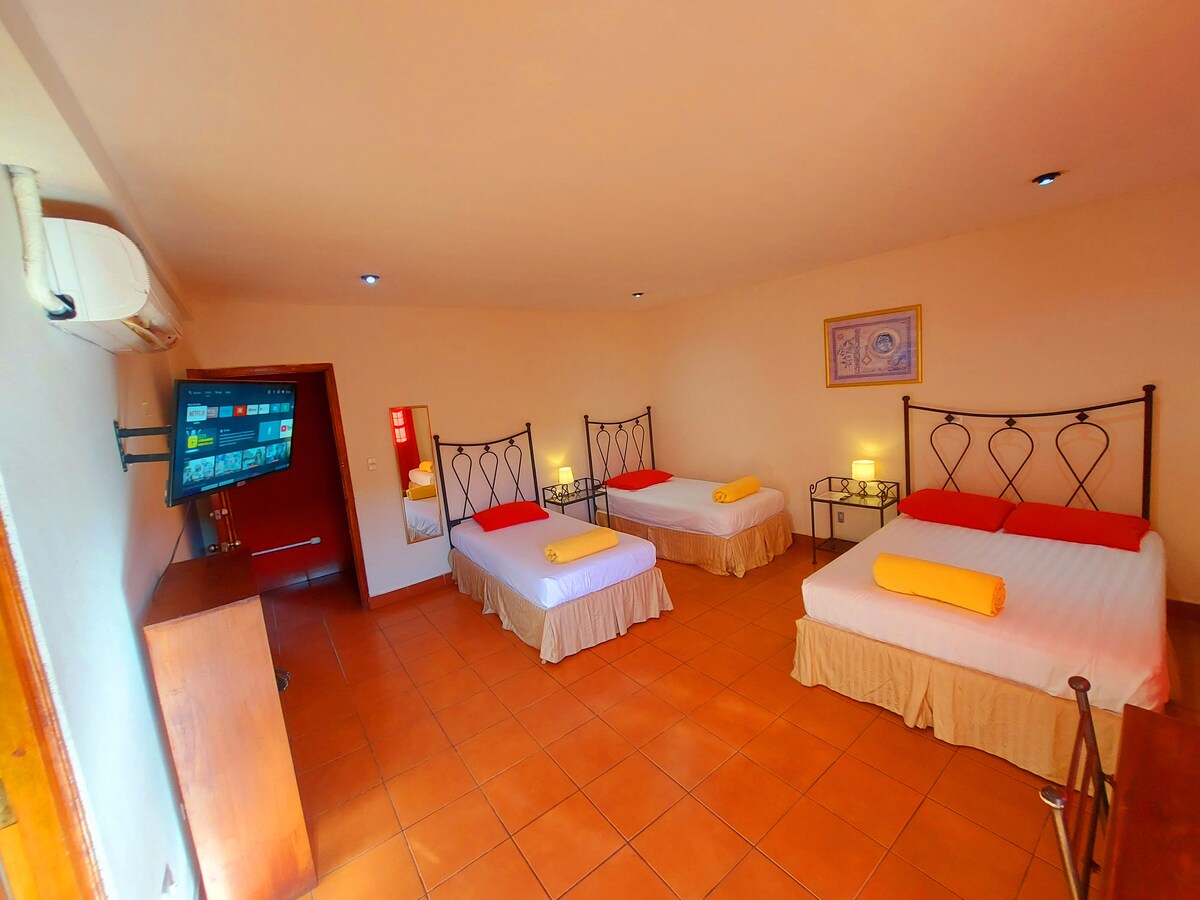 Disfruta del fácil acceso a tiendas y restaurantes populares desde este encantador lugar para hospedarte. Este anuncio consta de 4 habitaciones todas ubicadas en el segundo piso, cada una con su bano privado y aire acondicionado, con una capacidad maxima de 15 personas, con un total 5 camas matrimoniales y 5 camas unipersonales. Ofrecemos estacionamiento pago en la esquina del hotel en Bomberos (ubicado a 30 metros del local) con seguridad las 24 horas, Con un valor de U$3.50 USD por noche.