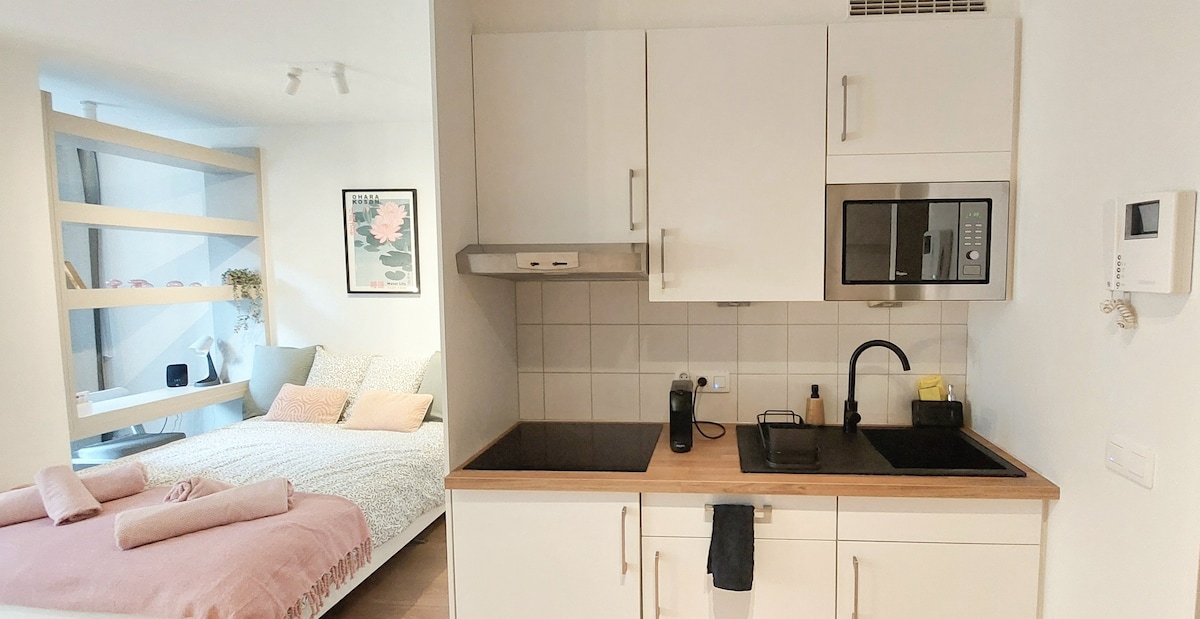 Questo splendido appartamento di 25m2 al 2° piano (senza ascensore) è composto da: → Un comodo letto matrimoniale (140 x 200) → Cucina attrezzata con forno a microonde, airfryer, tostapane, macchina per il caffè, bollitore, ecc... → Zona giorno con divano e tavolo da pranzo → TV 4K → Wifi veloce e sicuro → Un bagno con doccia con tutto il necessario → Biancheria da letto → Biancheria da bagno →> pulizia pro inclusa nel prezzo! Questo alloggio arredato con cura è provvisto di tutto il necessario per un soggiorno confortevole.