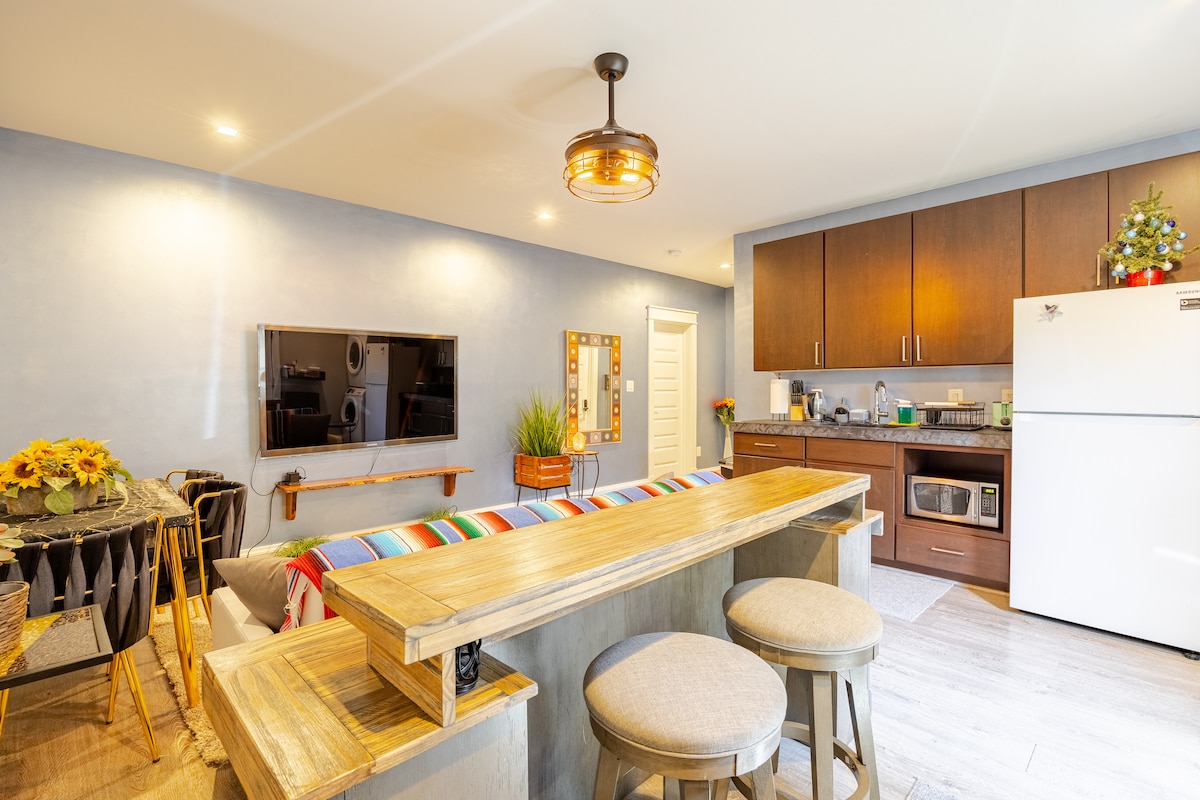 Ti diamo il benvenuto nel nostro elegante appartamento seminterrato, perfetto per i viaggiatori moderni. Che tu sia qui per lavoro o per svago, questo spazio ha tutto ciò che ti serve. Situato a pochi minuti dalla metropolitana, dall'aeroporto e dai principali centri di lavoro. L'appartamento dispone di una scrivania con doppio monitor, tastiera, mouse e connessione internet da 1 GB. Di notte, rilassati nel morbido letto king-size. Un divano futon convertibile con una TV da 65 pollici ti aspetta per le tue sessioni di binge-watching. Una lavatrice/asciugatrice e una cucina completa, con frigorifero e fornelli, completano lo spazio.