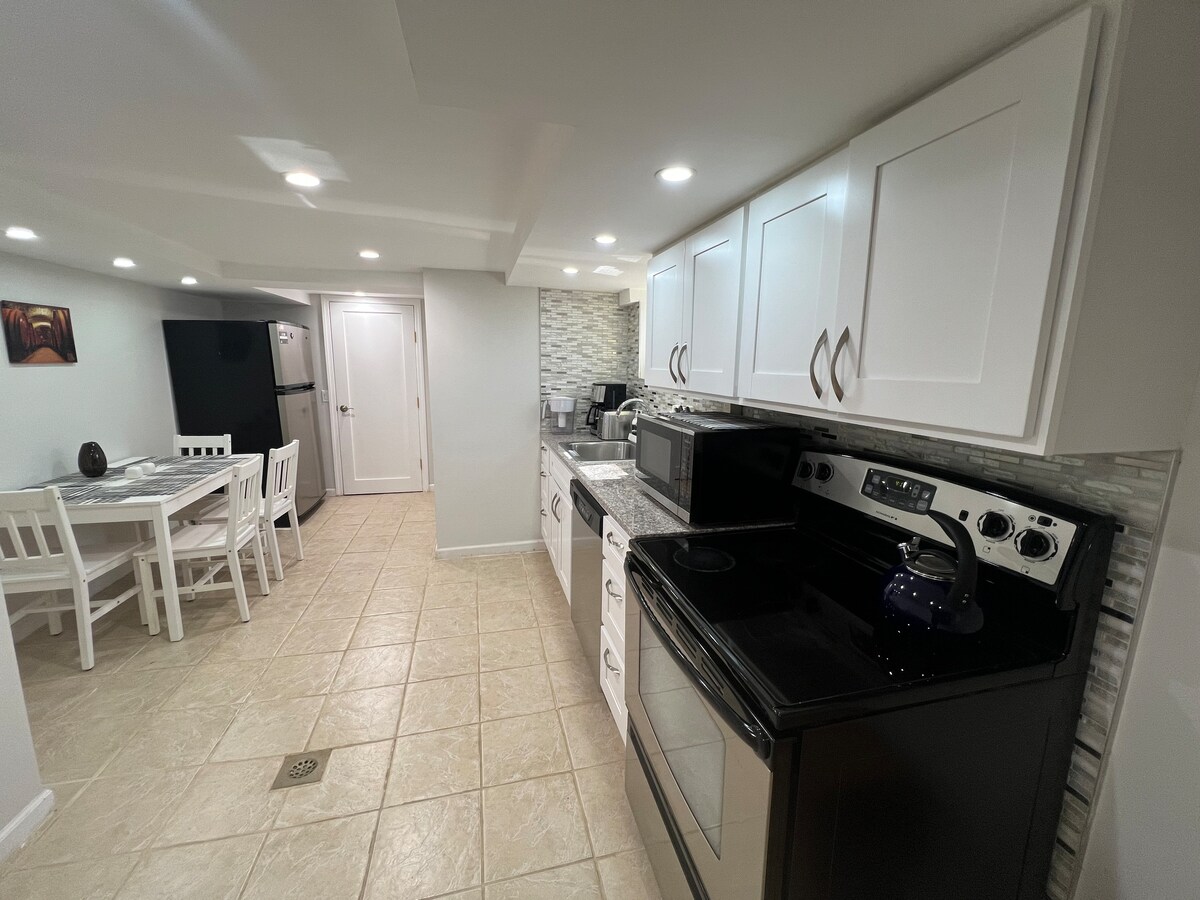 1 camera da letto, sala da pranzo con cucina completamente attrezzata. Bellissimo bagno. Nuovissimo appartamento in casa privata seminterrato. Ingresso privato, nessuna condivisione. Il parcheggio è disponibile su richiesta. Shampoo, balsamo, bagnoschiuma, dentifricio, spazzolino da denti, sapone per le mani, asciugamani. Caffè, bustine di tè e bottiglie d'acqua. 15 minuti in auto dall'aeroporto JFK. Vicino alla UBS Arena, Horse Race. Super Market, negozio di alimentari, lavanderia a gettoni a 3 minuti a piedi. Fermata dell'autobus 3 minuti a piedi. Green Acre Mall 4mi.