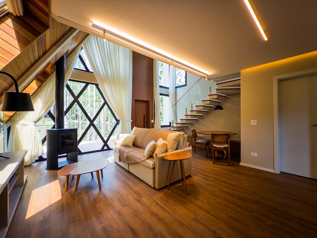 L'isolamento acustico e visivo del terreno garantisce la privacy che meriti. Comfort in tutte le stagioni, con aria condizionata in tutto lo chalet e un camino interno. Nella suite, un letto matrimoniale, una vasca idromassaggio e tende oscuranti offrono un riposo assoluto. Per rilassarti, goditi il suono di alta qualità, l'esclusiva amaca orizzontale esterna e la tranquillità della natura.
