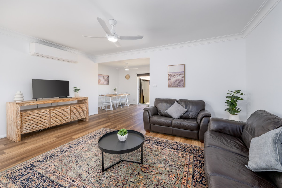 Goditi la perfetta combinazione di privacy e comfort in questa accogliente casa con 2 camere da letto. 1 camera con letto queen-size e sistema split Camera con 2 letti singoli king-size Adatto alle famiglie e agli animali domestici (si applica un piccolo supplemento per animali). Questo rifugio sicuro offre comfort, nonché lavatrice, asciugatrice e stendibiancheria. Una zona pranzo all'aperto ombreggiata e un cortile privato con erba. Un doppio posto auto coperto sicuro e l'alto cancello d'ingresso garantisce la tua privacy. Ottima scelta per lavorare da remoto o per una vacanza in famiglia.