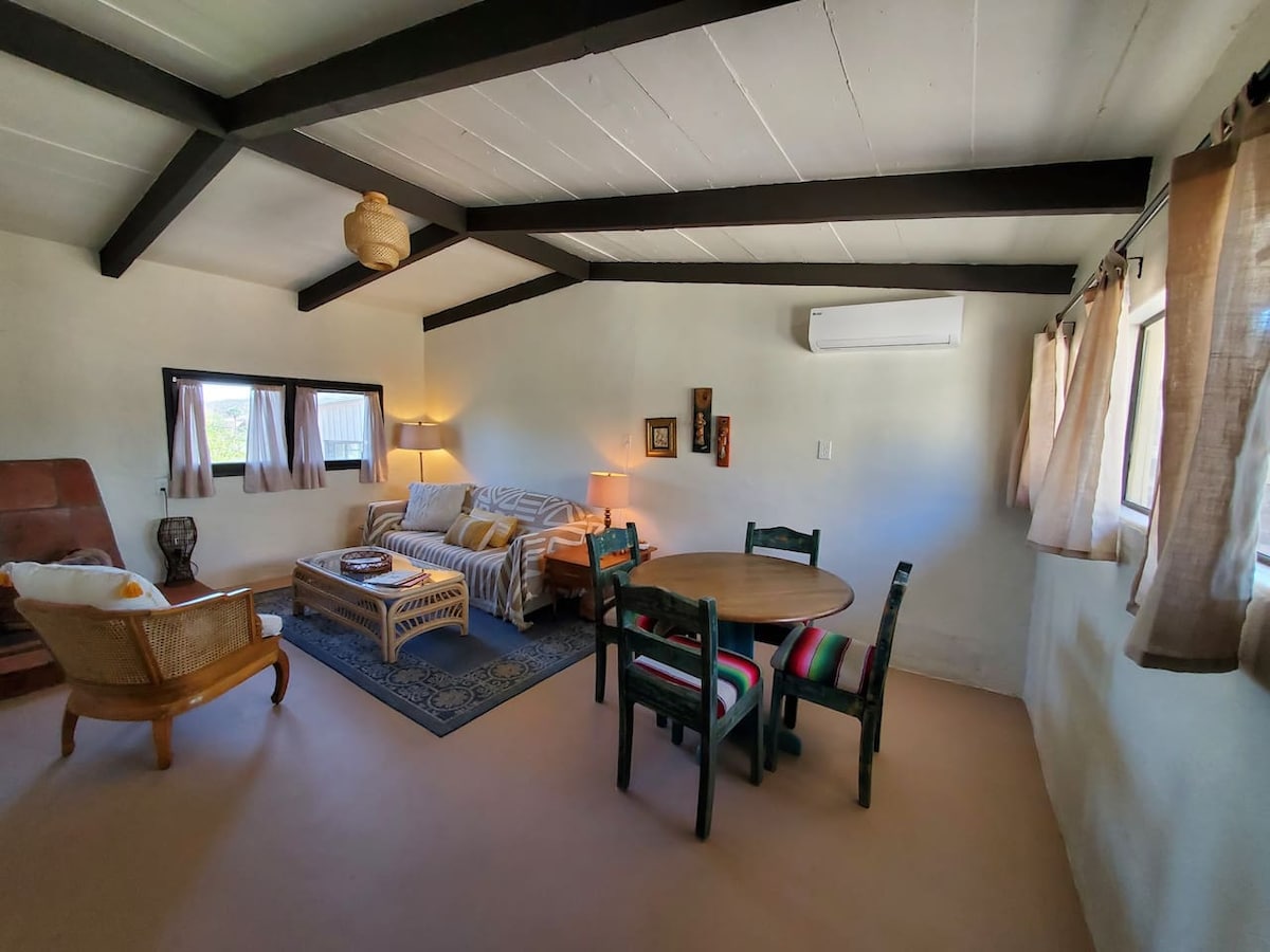 This studio is spacious & comfortable. It is detached, secluded, on a quiet street, ample street parking and completely fenced in. The yard has a ramada with a table, chairs, string lights and a chiminea Inside, you’ll love the exposed adobe, skylight, and wood beam ceilings. The fully stocked kitchen is updated, with full size appliances. In the heart of Armory Park, it is close to 5-points, downtown, historic 4th Ave and Uof A. Ask me for dining, hiking, shopping and day trip recs!