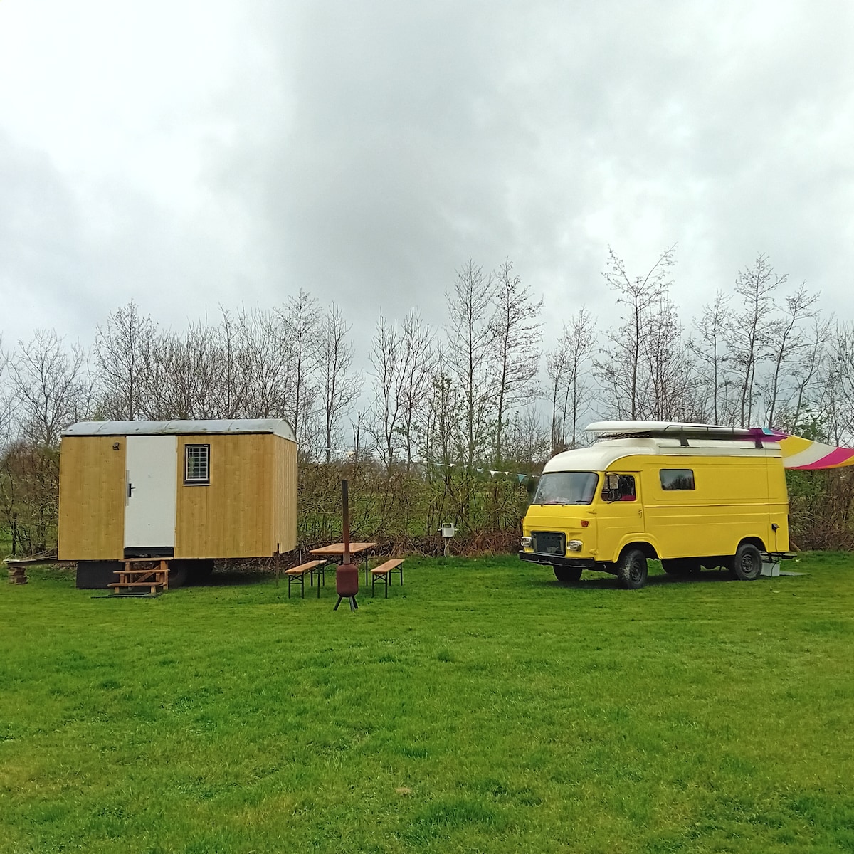 Altijd al een nachtje in een camper willen doorbrengen? Dat kan bij ons in niet 1 maar 2 unieke campertjes tegelijk. Je kan eerst starten met een kopje koffie of thee in een knusse zithoek in ons Daihatsu campertje uit 1986. De badkamer is vlakbij en volledig privé. Als je moe wordt kan je in een knalgele vespacar P2 in een opgemaakt bed (140×200) met verwarming de nacht doorbrengen. Tevens kan de Daihatsu worden omgebouwd tot een tweepersoons slaapplekje (160×200). maximaal 4 slaapplaatsen