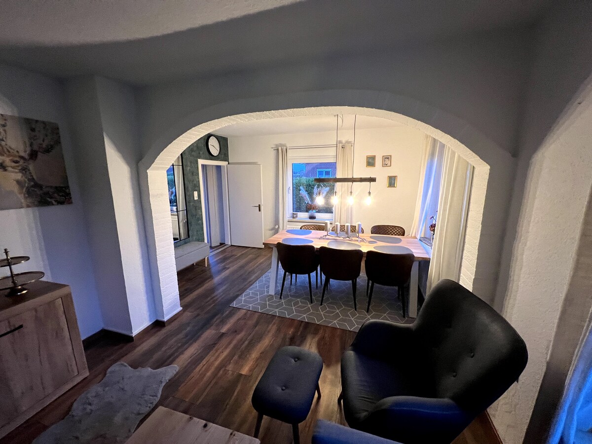 Nel cuore della natura della Frisia orientale, tra terreni, canali e alberi idilliaci, si nasconde la nostra casa di campagna (Grünhoff's Landhuus) con il suo fascino storico. L'"Oll Kohstall" colpisce per la sua ampia zona soggiorno-pranzo con antichi tralicci, tre affascinanti camere da letto che non potrebbero essere più diverse, un bagno moderno con ampia cabina doccia e una cucina dal design particolare. L'ampia proprietà invita a rilassarsi e divertirsi.