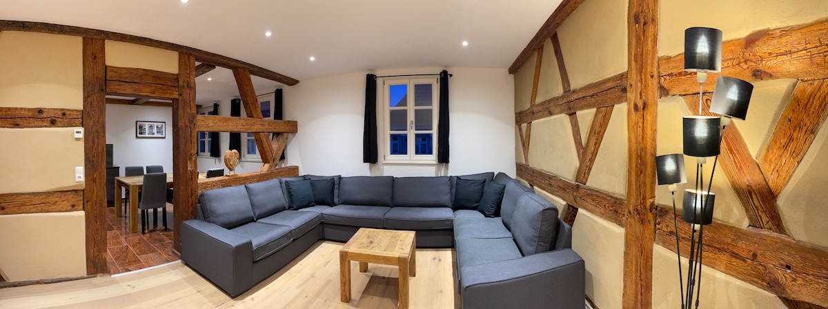 Nella piccola casa di legno circondata da case a graticcio nel tranquillo centro del villaggio è possibile rilassarsi e godersi la natura della vicina Franconia. La costruzione in legno ecologica in stile loft rende l'appartamento unico. Si riscalda con una stufa a legna. Nel bagno e nella camera adiacente c'è anche il riscaldamento a pavimento. Nella zona giardino protetta dalla vista sono a vostra disposizione una sauna, una doccia con acqua fredda con vasca, lettini e zona pranzo. La zona circostante attira con numerose attività all'aperto.