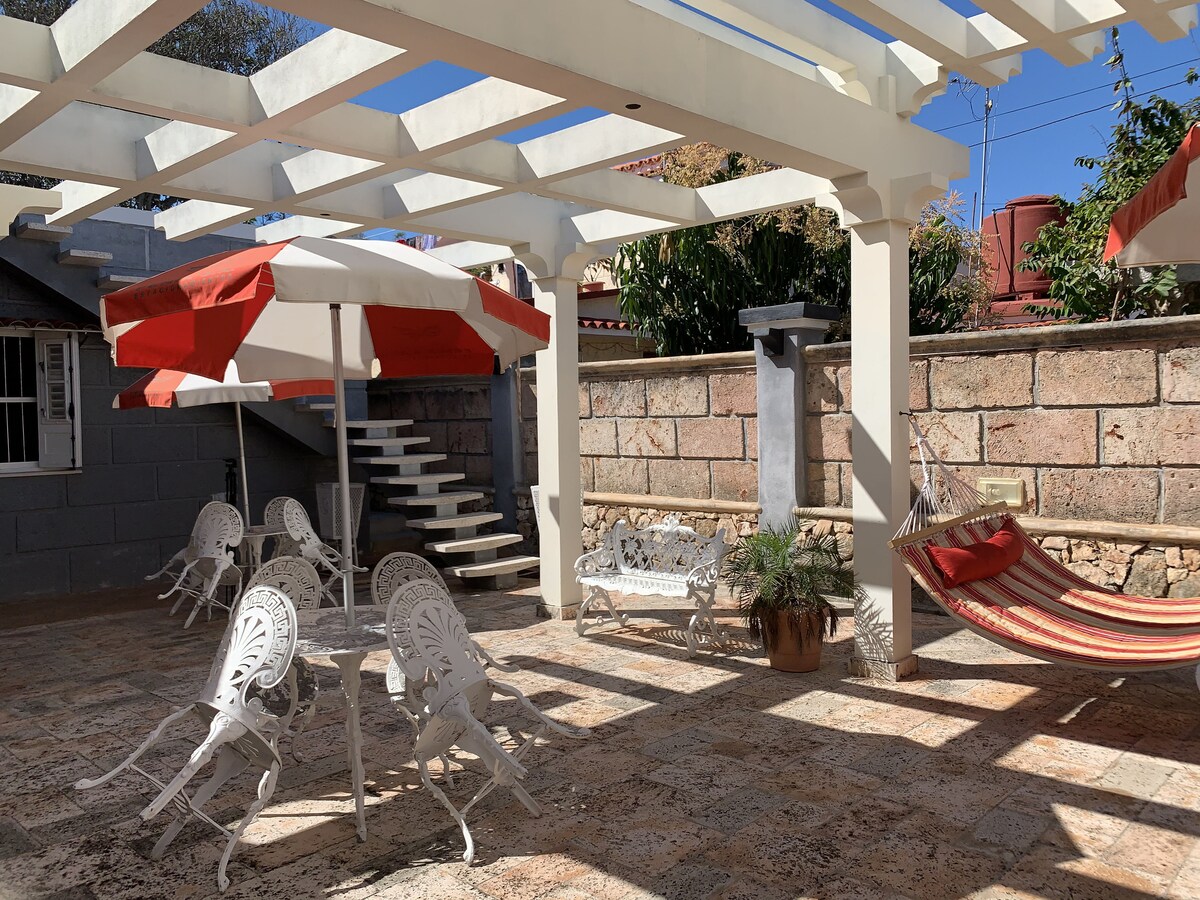 L'ampio appartamento con una camera da letto si trova in un lussuoso giardino, WIFI E GENERATORE GRATUITI e pannolini SOLARI quasi senza interruzioni di corrente, lontano dai rumori della città. Lo spazio è pensato per adattarsi a una vacanza rilassante dove potrai rilassarti sulla tua amaca privata, leggendo il tuo libro preferito. p al tuo arrivo accolto da una grande piscina gonfiabile e lettini prendisole oltre che dal tradizionale Ranchon cubano.