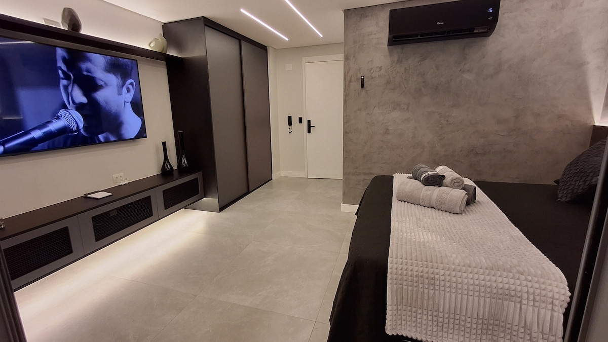 Nuovo monolocale a Gran Maia Giardino, un condominio di lusso a Guarulhos. Ideale per soggiorni brevi o lunghi. Può ospitare 3 persone con comodo letto matrimoniale e divano letto, cucina attrezzata e aria condizionata. Condominio con piscina, palestra, parco giochi, ludoteca, lavanderia, spazio per animali domestici, negozio di alimentari e parcheggio con sicurezza 24 ore su 24. Posizione privilegiata centrale, facile accesso alle principali strade della città, a 7 km dall'Aeroporto gru e vicino a mercato, centri commerciali, farmacie e ristoranti.