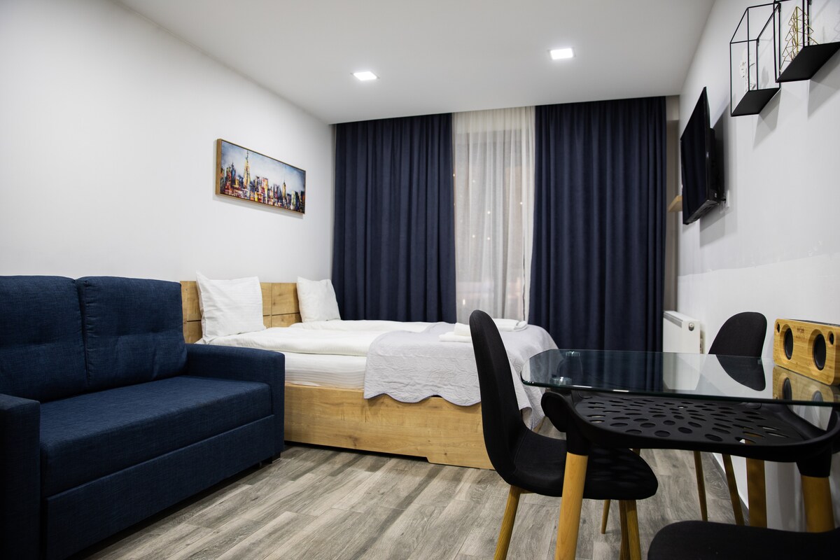 Ciao, mi chiamo Andria, il mio appartamento confortevole e moderno è situato accanto a Gondola Lift. Nel cuore di Gudauri. Nel nostro edificio abbiamo: receptionist Piscina, sauna (sia umida che asciutta) Jacuzzi - ( costo 120GEL circa 40 euro) Ristorante, colazione (a pagamento) L'appartamento di tipo Monolocale (35 m2) ha tutto per le tue vacanze perfette - Wifi gratuito; Cucina completamente attrezzata; TV (107cm); Parcheggio gratuito, Bagno con Lavatrice e balcone con una splendida vista sulle montagne.