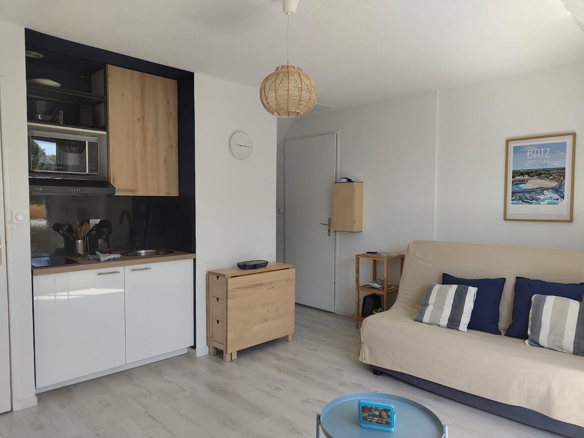 Grazioso monolocale di 23m² nel centro di Batz-sur-mer. Situato in posizione ideale, tutto a piedi! A 300 metri a piedi dalla spiaggia di St Michel e da tutti i servizi (mercato, negozio di alimentari, panetterie, ristoranti…) Al 2° ed ultimo piano di una residenza tranquilla, composto da un soggiorno molto luminoso con divano letto 130*190, angolo cottura, una piccola zona notte con letto singolo 90*190, bagno, WC indipendente, un balcone con vista mare.