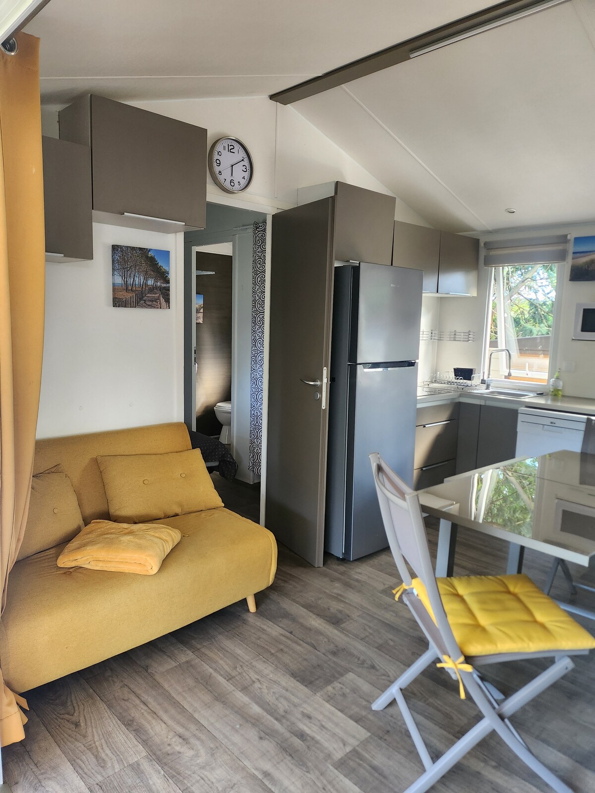 Affascinante bungalow con tutti i comfort 4/5 persone situato in un campeggio 4* 1 camera per 2 persone con 1 letto da 140 e guardaroba 1 camera per 2 persone con 2 letti da 80 e armadio 1 divano letto da 120 cm - Lavastoviglie - Lavatrice - Caffettiera a cialde - Bollitore - Tostapane - Spremiagrumi - TV - Terrazze attrezzate - Posto auto privato - Wifi - Aria condizionata Sono fornite lenzuola e biancheria da bagno. Posizione ideale Accesso alle infrastrutture del campeggio.