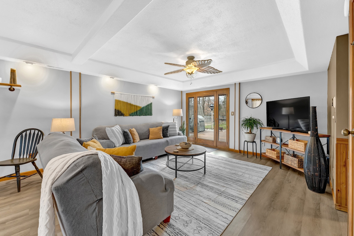 Bring the family (and up to 2 dogs) to our step-free cottage just 0.1 mi from Bay Pointe's wedding venue and under a mile to Gun Lake! The fenced backyard, firepit, hammock, games, and patio dining make it perfect for groups, families with kids and pets. Sleeps 6 with a fully stocked kitchen, coffee/tea bar, and private workspace. Guests love our thoughtful touches and 5-star hosting. ✨ August, September, and October weekends are open - book your end-of-summer getaway or fall retreat now! ✨