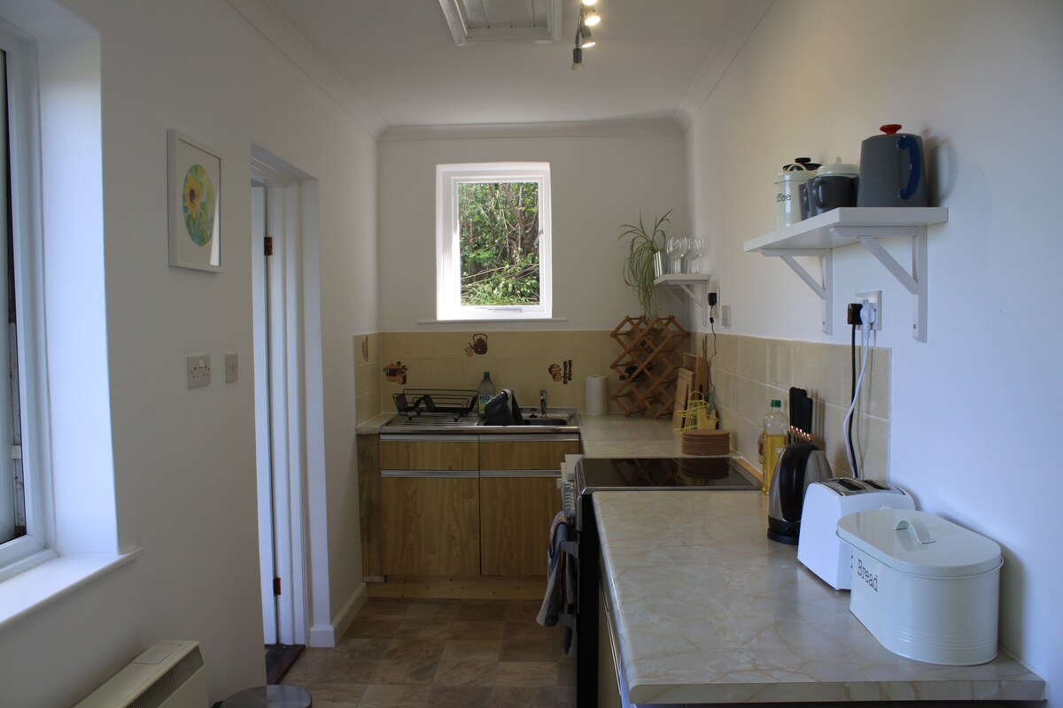 Accogliente monolocale di lusso per due persone ai margini del villaggio, con cortile soleggiato privato, giardino con prato, letto king-size in memory foam, bagno interno con cabina doccia elettrica e cucina completa con forno ventilato, piano cottura in vetroceramica a 4 fuochi, estrattore, forno a microonde e lavatrice/asciugatrice. Wifi gratuito e smart TV Freesat con lettore DVD. Caminetto elettrico. Divano. A meno di 10 minuti a piedi dalla collina fino al lungomare e al villaggio con spiaggia e servizi. Pace, tranquillità e privacy. Parcheggio privato e spazio per girare.