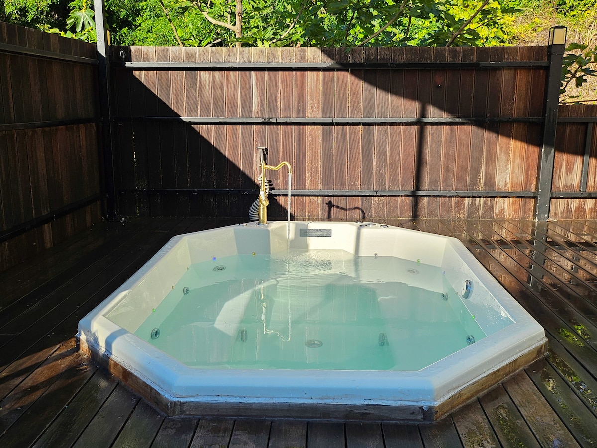 Ayeonru: stufa a legna, letto, proiettore a raggio laser, vasca da bagno all'aperto per 6 persone, barbecue con griglia e braciere
