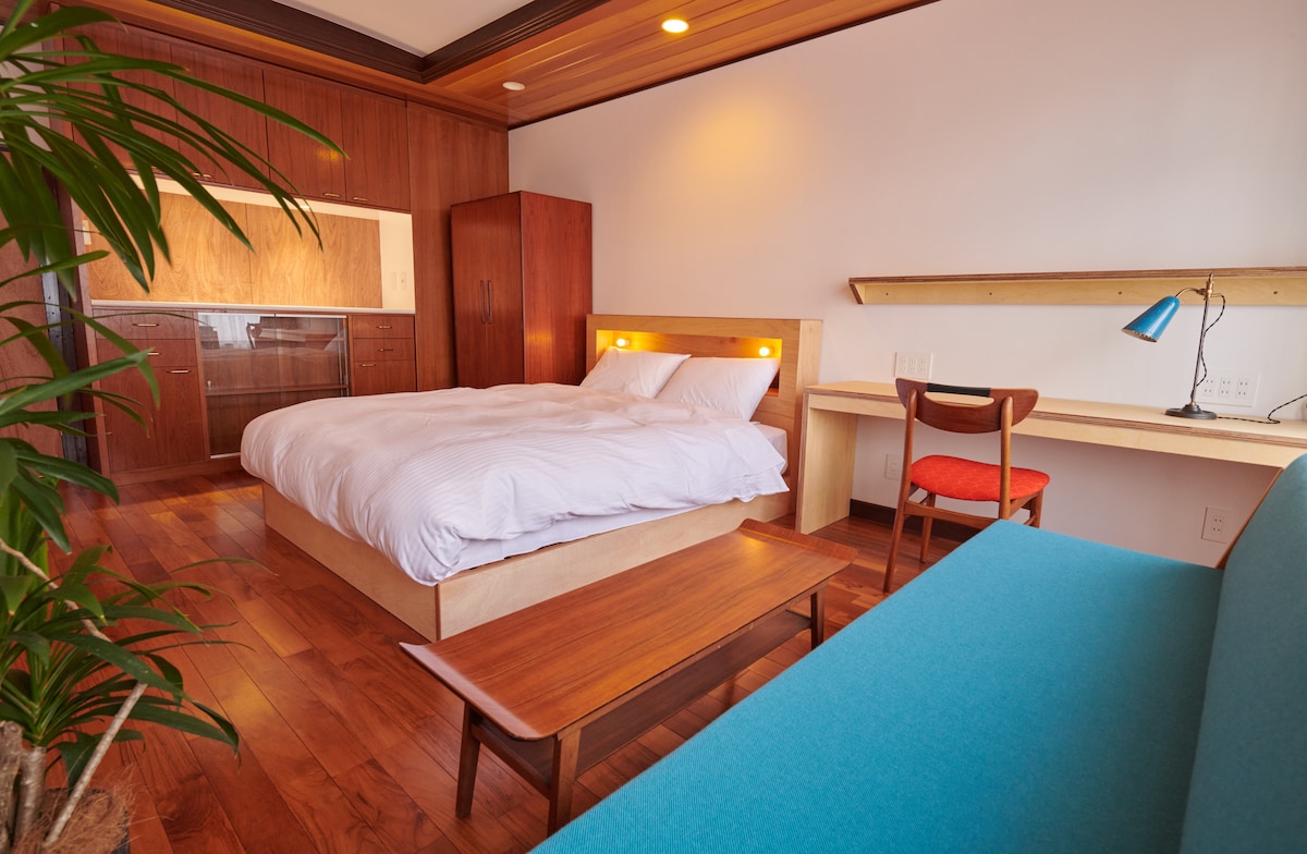 小田原城徒歩6分の和モダン宿。ヴィンテージクイーンルーム【RYOKAN PLUM】