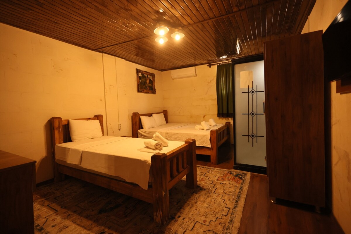 Odamız 3 kişilik kapasiteye sahip olup, çift kişilik geniş yatak ve ek olarak konforlu bir tek kişilik yatakla donatılmıştır. Her ne kadar 3 kişiye uygun olsa da, çiftler tarafından da sıkça tercih edilen ve ferahlığıyla beğenilen bir odadır. Balıklıgöl'e ve çarşıya sadece birkaç dakikalık yürüme mesafesindedir. Bahçemizde ücretsiz çay-kahve ikramımızla güne keyifli başlayabilirsiniz. İster çift olun, ister küçük bir grup — bu odada kendinizi evinizde hissedeceksiniz.keyfini çıkarın.