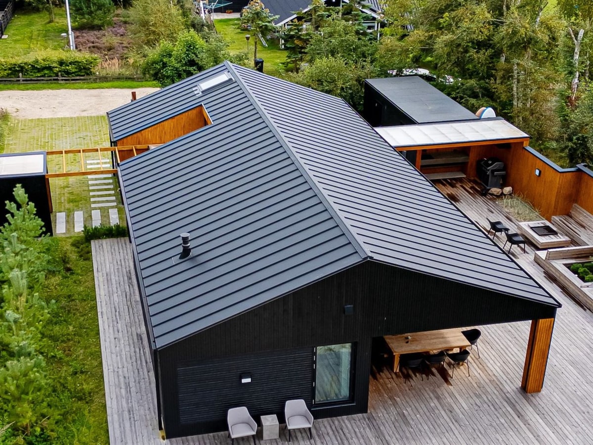 The perfect holiday home for peace and relaxation This holiday home is ideal for those seeking a break from everyday stress. A place to relax all year round. The holiday home offers: -Sauna -Hot tub -Outdoor shower with hot and cold water -Private and secluded grounds with unique outdoor areas The beach is only 1.2 km away. Comfort and coziness: -Wood-burning stove and air conditioning -Outdoor kitchen -Pizza oven and grill -5G WiFi and Chromecast -Bicycles available for free use