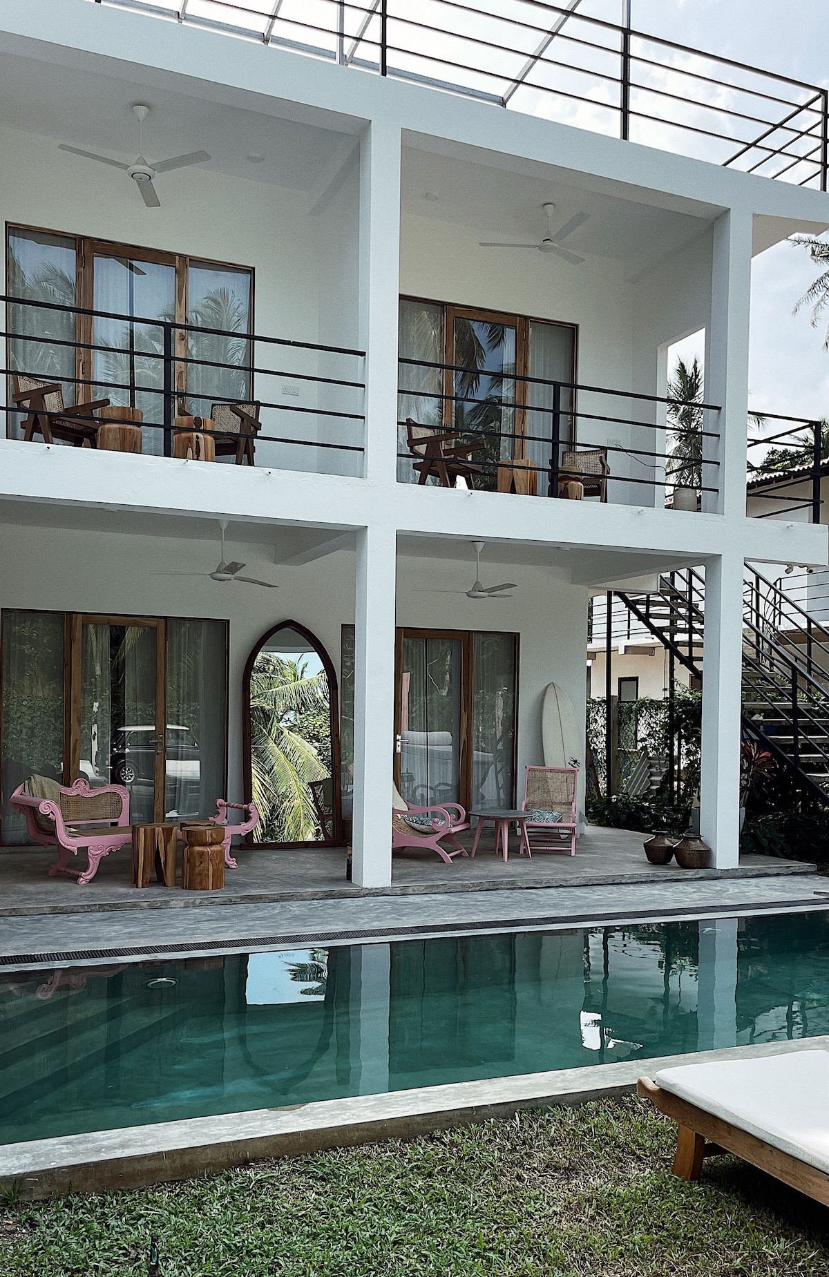 The Palm Lanka is a peaceful, unique and luxury villa near Tangalle.Featuring four ensuite bedrooms, rooftop terrace, yoga and fitness studio, cold plunge, open garden kitchen/bar and swimming pool overlooking lush palmtree garden. Relax in a new villa, bright room with balcony and private bathrooms. Every day we get visits from colourful birds, monkeys and you can even hear peacocks singing. We have the best team: Manel and Suresh who will take care of all your needs and also nightly security.