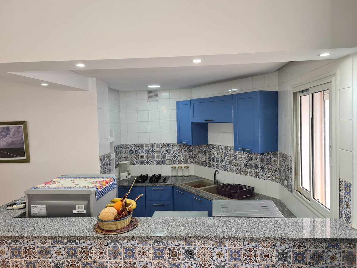 appartamento S+3 di alto standing e arredato con gusto al piano terra, con accesso a una terrazza. Situato a Cap Bon a Ezzahra (7 km da Kélibia). Un posto tranquillo, silenzioso e sicuro. Dispone di 3 camere da letto di cui 2 con un letto grande ciascuna e 1 con due letti singoli. Un soggiorno e cucina ad aria aperta con una grande porta finestra che si affaccia su una terrazza. Distanza dalla spiaggia: 1 minuto a piedi Se famiglia numerosa, vi invito a scoprire anche il mio s+1