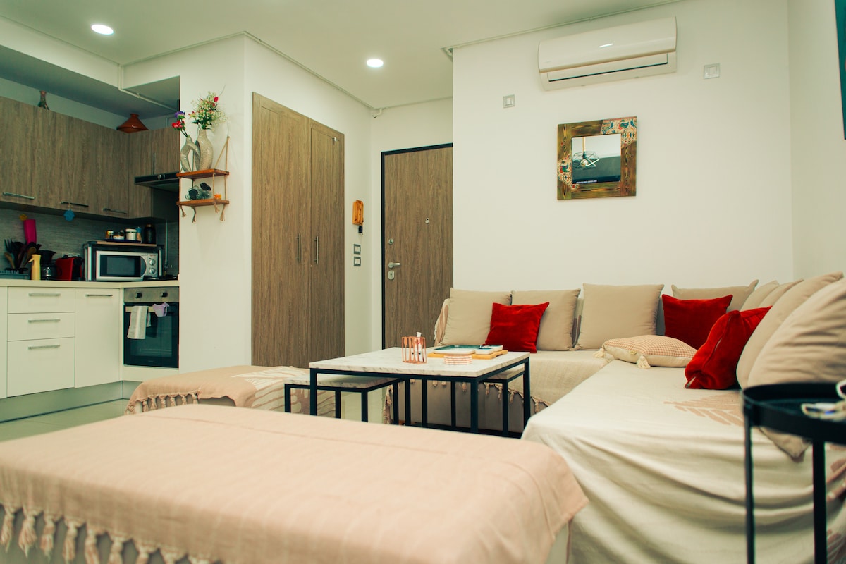S+ 1 dans une résidence nouvellement bâtie équipée d'un ascenseur, de très haut standing, près de la plage, 2 piscines pour adultes et enfants. L'appartement est très bien équipé: climatiseur, tv LED draps... La partie jour abrite un salon lumineux grâce à un balcon. La cuisine est aménagée et ouvre sur un séchoir. Quant à la partie nuit, elle loge une chambre à coucher et une salle de bain. Mon logement est parfait pour les couples, les voyageurs d'affaires et les familles (avec enfants).
