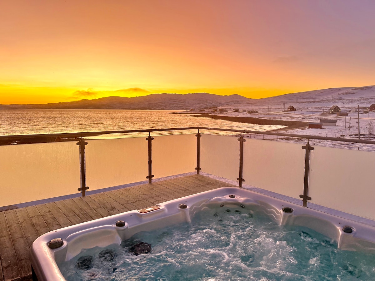 Splendida vista sul fiordo, vasca idromassaggio e aurora boreale