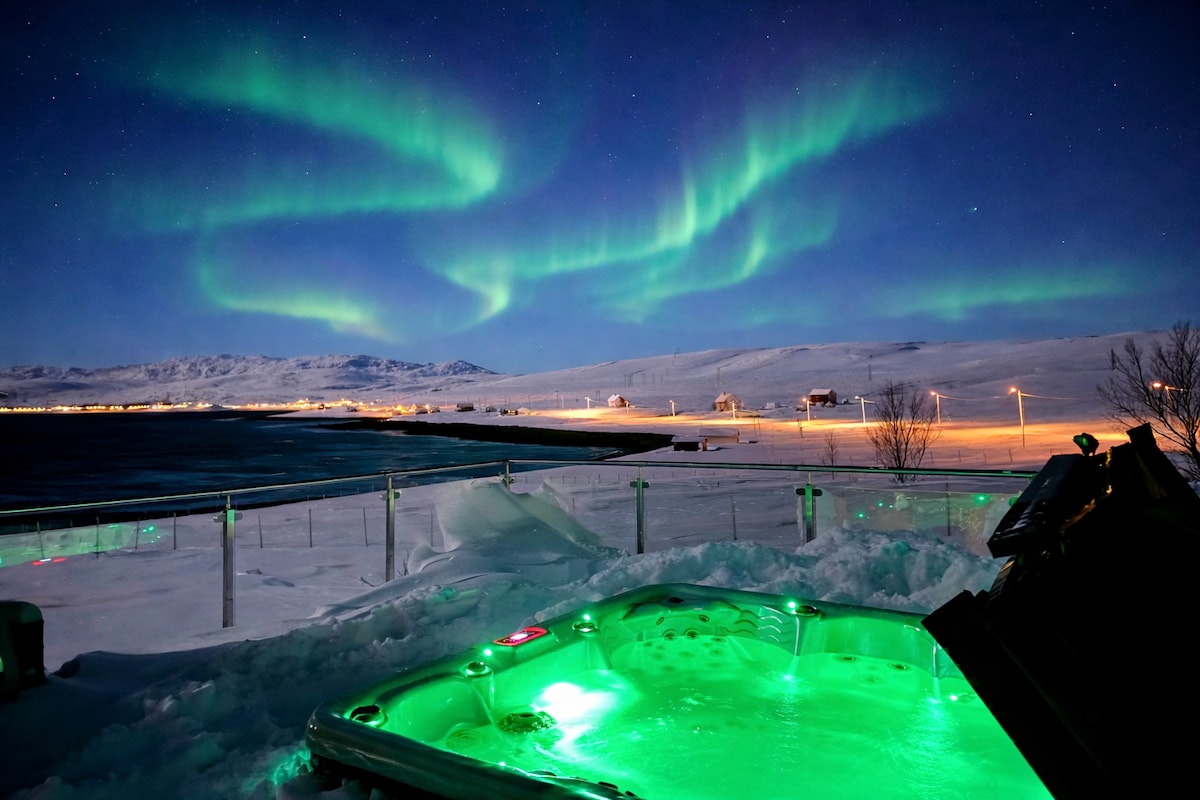 Splendida vista sul fiordo, vasca idromassaggio e aurora boreale