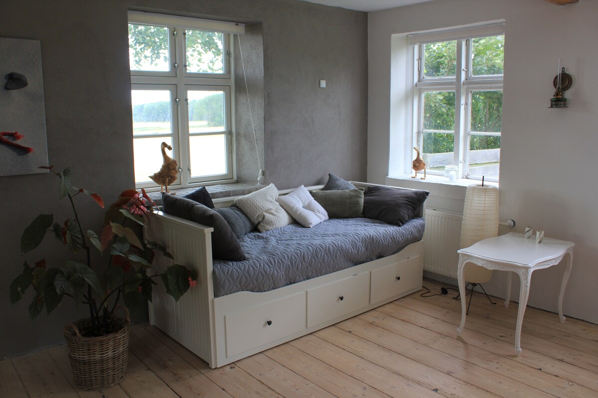 Appartamento in affascinante cortile dal 1866. Situato al 1° piano, accanto a un altro appartamento. Comprende un ampio soggiorno con cucina, zona pranzo e divano. 2 camere da letto e bagno con vasca. La zona è per gli amanti della natura, nel mezzo della natura incontaminata di Bornholm, con un lago di cava. Quando apri la finestra, sei accolto da un coro di canti di uccelli. Ci sono ingresso comune, giardino, barbecue, ecc., con un altro appartamento