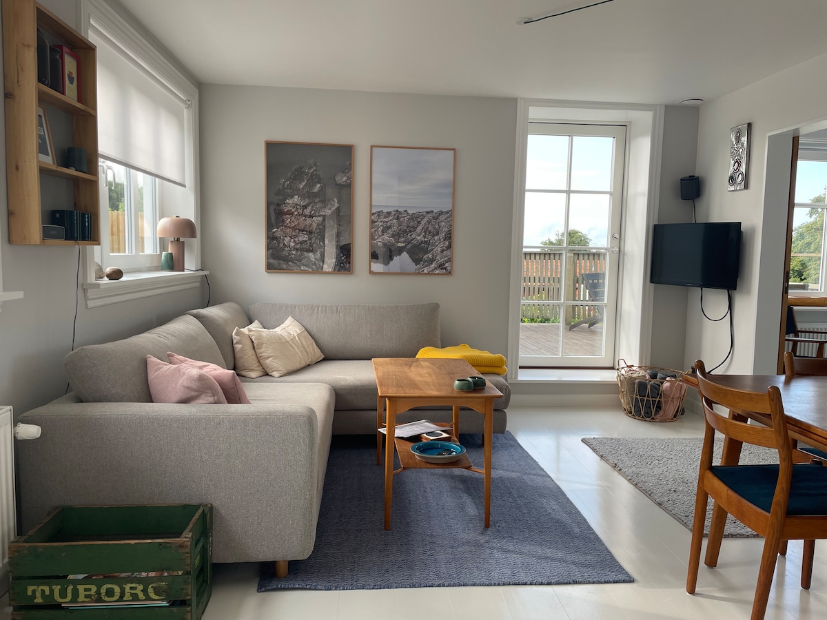 45m2 grande gioiello di un appartamento a Sandkås. A 70 metri dal bordo dell'acqua. Può ospitare un totale di quattro adulti e alcuni bambini piccoli suddivisi in una camera da letto con un letto molto grande, che richiede di dormire con i bambini (220 * 200 cm) e un divano letto nel soggiorno (140 * 200 cm). Il bagno è nuovo e con un ampio doccia. C'è una nuova cucina con lavastoviglie. C'è una grande terrazza esposta a sud dove c'è sole tutto il giorno. A 50 metri dalla porta c'è uno dei sentieri costieri più belli della Danimarca che ti porta direttamente nella città di Allinge (3 km)