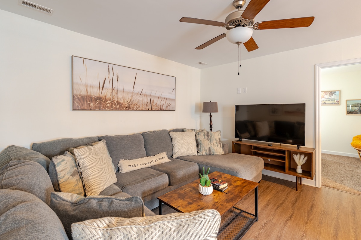 Sentiti a casa in questa confortevole e tranquilla unità immersa accanto a un tranquillo laghetto, dove potrai goderti splendidi tramonti ogni sera! Grazie all'ampia zona giorno a pianta aperta, potrai rilassarti e guardare i tuoi film o programmi preferiti sulla smart TV da 80 pollici. La cucina è completamente attrezzata con tutto il necessario per preparare un pasto, ma puoi anche provare i ristoranti nelle vicinanze. Siamo a breve distanza in auto dalle spiagge incontaminate di Topsail Island, a metà strada tra Wilmington e Jacksonville.
