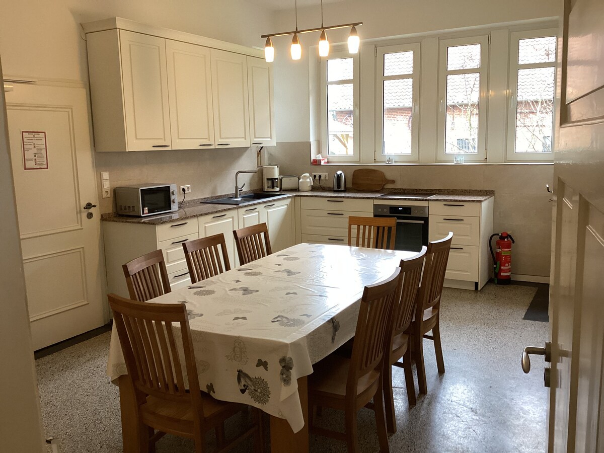L'elegante casa sul tetto a 4 frontoni in struttura a graticcio è ideale per viaggi di gruppo o tempo libero aziendale. Posizione tranquilla ai margini del paese nel verde in un frutteto. Garantire un soggiorno e /o lavorare rilassati: - l'ampio soggiorno con zona pranzo, camino, bar della casa e accesso alla terrazza/giardino - 2 logge al piano superiore - Sauna, ellittica - Comoda sala studio/riunione. Internet via fibra ottica - 5 camere da letto, 2 bagni, cucina, bagno per gli ospiti - Dispensa e ripostiglio