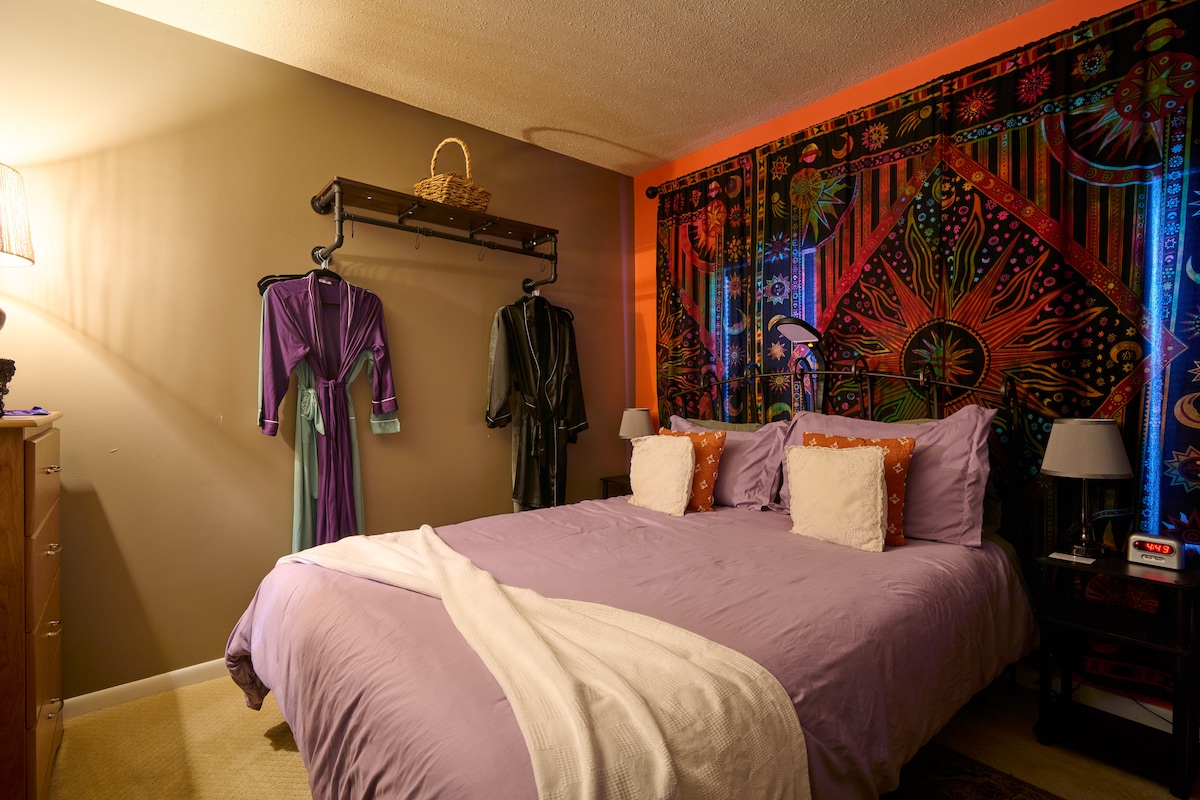 🌀Fuga a Marigold Sunrise. Un alloggio accogliente lontano da casa! - Rifugio boho! Audace. Spensierato - Accogliente fascino rustico Un monolocale privato di 49 metri quadrati per vacanze o soggiorni prolungati (oltre 28 giorni) Concediti: - Letto matrimoniale soffice; divano letto (2 letti singoli) - Piatti accoglienti nell'incantevole zona pranzo. Angolo cottura rifornito di tutto il necessario - Bagno privato completo con doccia rinfrescante - Zona giorno, TV Roku da 70 pollici; accogliente angolo ufficio - Patio con pergolato all'aperto, perfetto per il relax - Lavanderia in comune per ogni esigenza