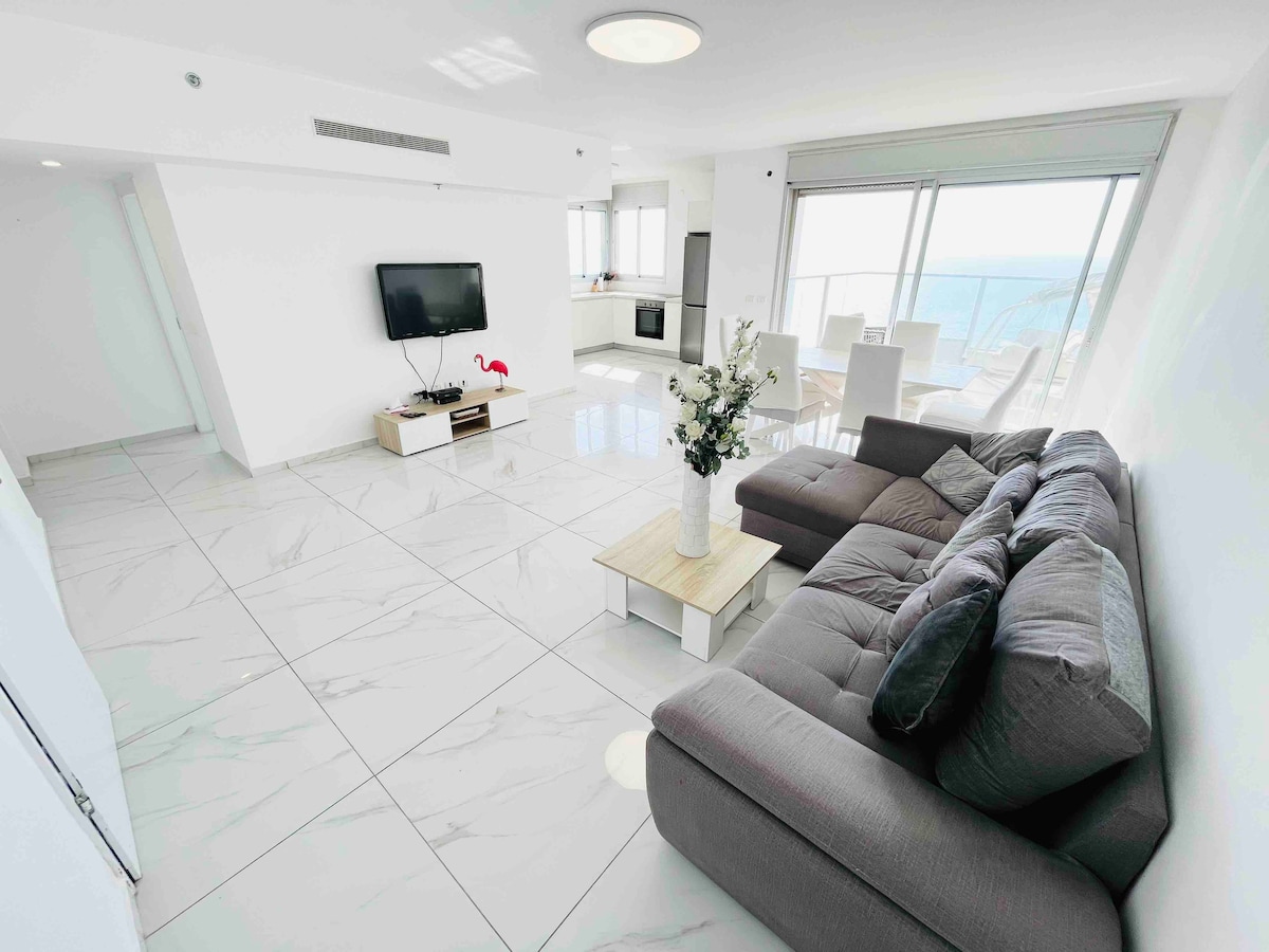 Enjoy panoramic sea views, refreshing sea breeze and the serene sound of waves, from every corner of the 3-rooms apartment. - 2 Bedrooms, with European King and Double bed. Both have their private bathrooms, ensuring utmost comfort and privacy. - Living Room & fully equipped Kitchen & Dining Area - 1-minute walk to the beach, cafes, restaurants, shops on Nitza Avenue sea promenade. The seasonal beach, with beach services and rescue, awaits on downhill. - City center within walking distance.