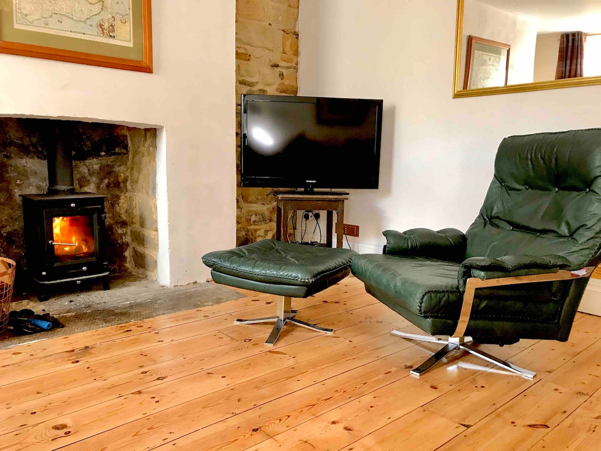Accogliente cottage con stufa a legna e vista sulla campagna.