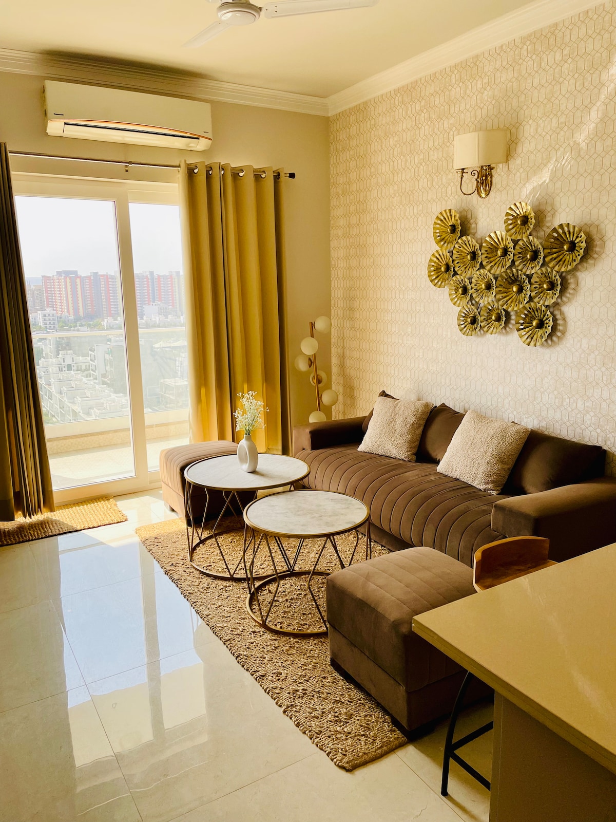 Modern 1BHK in Central Park Flower Valley. Sunlight fills the bedroom with a king bed and calm interiors. The balcony is a little wild, making it perfect for fresh air, chai, or a smoke under open sky. Kitchen is fully set for basic cooking. Smart TV, Wi-Fi , AC + inverter backup keep you comfortable. Great for business trips, short stays or slow weekends. A peaceful pocket of soft luxury in Gurugram. Soft daylight in every corner feels designed to breathe with a beautiful Aesthetic pool View.