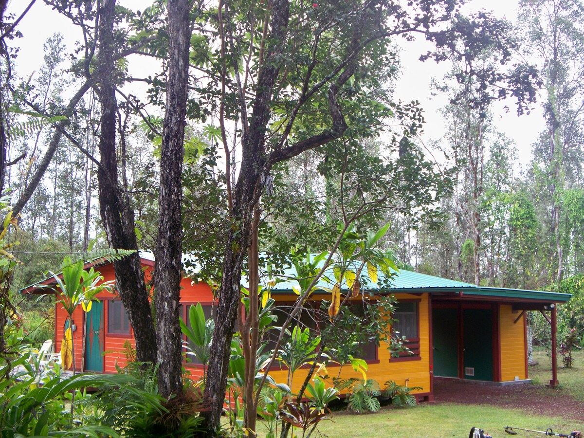 Bungalow privato, di recente costruzione/ristrutturazione, su 3 acri in un lussureggiante, antico mangroveto e in una splendida cornice nella giungla. Lanai schermato con cortile privato e vista rilassante. Patio esterno in cemento recintato e ombreggiato con tavolo e sedie. Anche se l'alloggio è lontano dalla lenta strada di cenere rossa che ti porta lì, la città e i negozi sono accessibili tramite la nuova autostrada con viste memorabili attraverso il flusso di lava Kilauea del 2018.