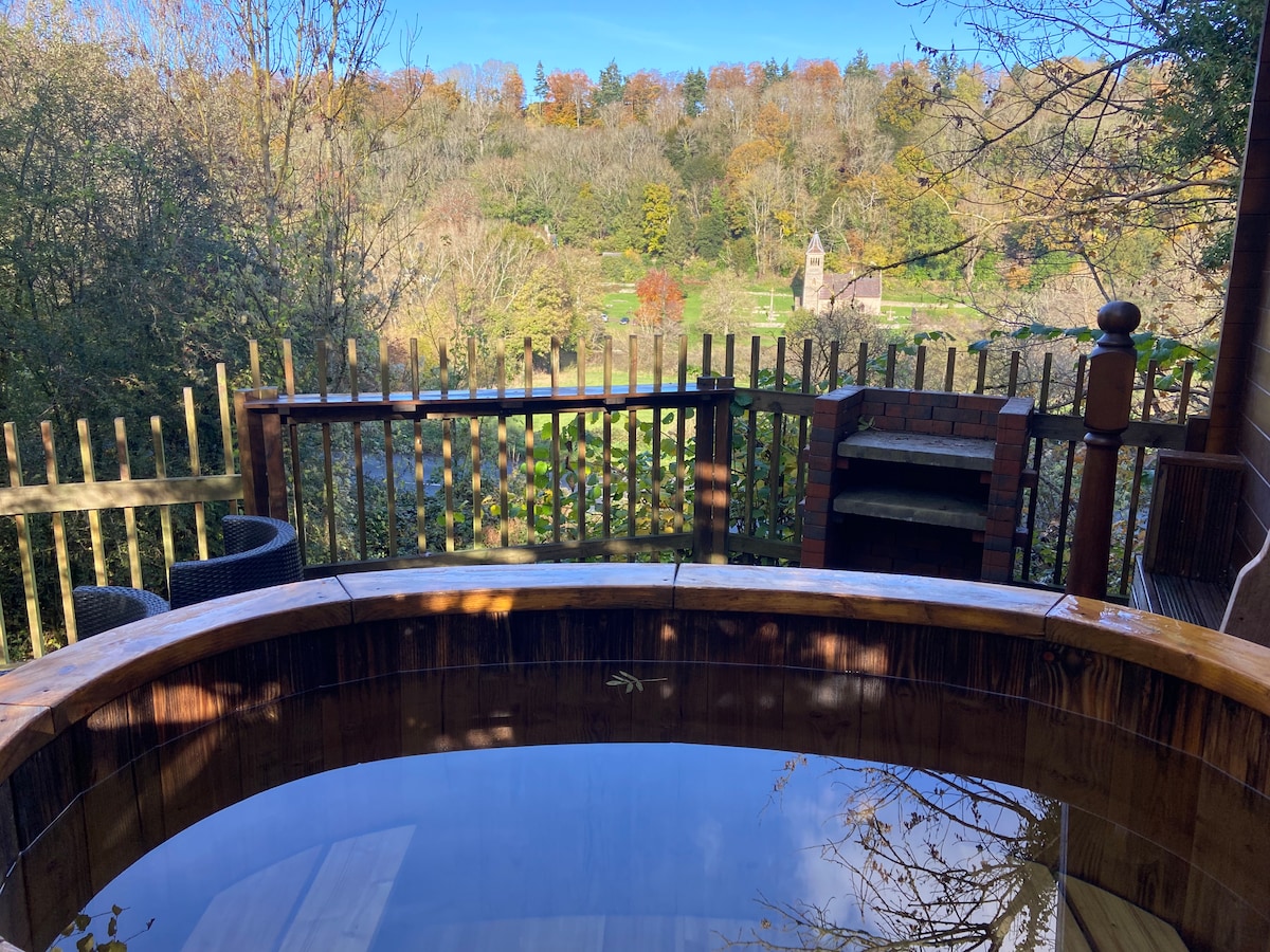 Splendidamente situato lodge in legno con 2 camere da letto in posizione elevata con viste sul fiume Wye e sulla valle. Un luogo ideale per immergersi sia nella Foresta di Dean che nella Wye Valley. Vasca a legna autogestita per 2 persone e sauna per 2 persone. Una camera matrimoniale con letto king size e una camera doppia con 2 letti singoli. Un ampio soggiorno e sala da pranzo a pianta aperta e una cucina completamente attrezzata con lavatrice, lavastoviglie, frigo/congelatore, forno a microonde e macchina del caffè. Wifi illimitato. Terrazza privata con braciere e barbecue