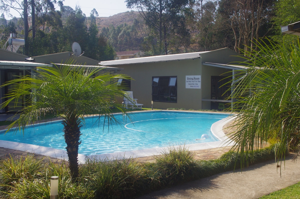 Rondavels Ensuite: sono dotati di doccia e servizi igienici e di un accogliente letto matrimoniale. Vengono forniti asciugamani e piumini extra. Puoi sempre venire al bar per una birra swazi ghiacciata o fare una passeggiata di cinque minuti fino alla montagna per ammirare il tramonto. È inclusa anche la colazione.